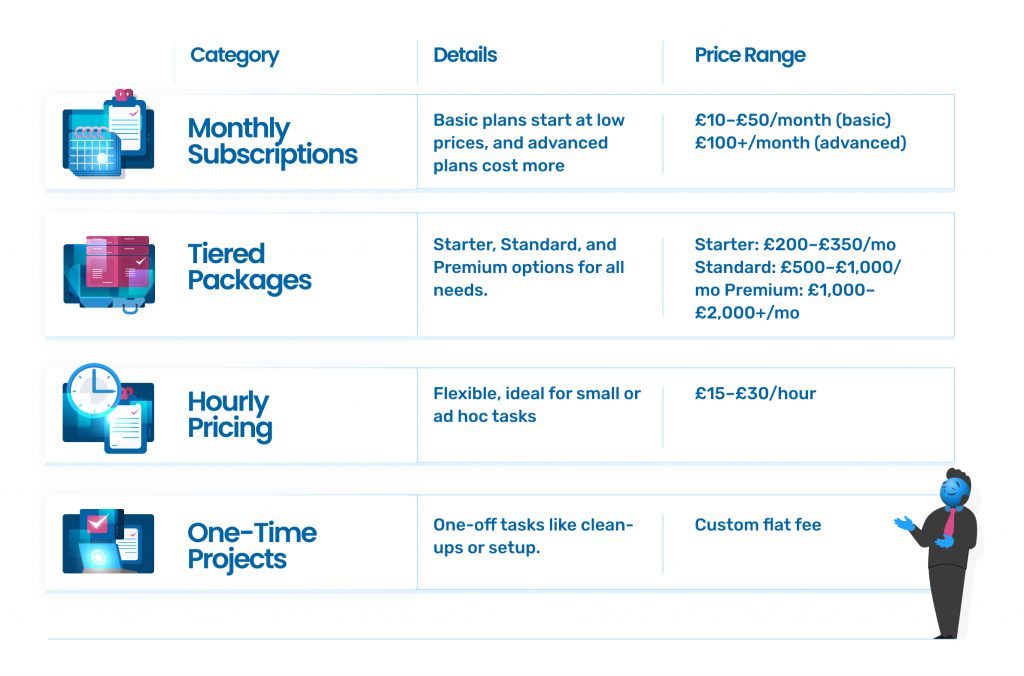 - Starter: Basic services such as monthly bookkeeping, bank reconciliation, and simple reporting, ranging from £200–£350 per month.