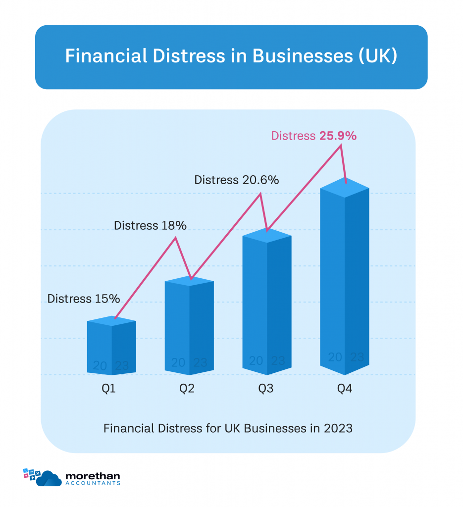 In Q4 of 2023, the ‘critical’ financial distress levels rose over 25% compared to Q3 2023. This exponential rise caused 47,000 UK businesses to experience a near collapse in Q1 2024. The core cause behind such distress is mismanaged and prone to error financials.